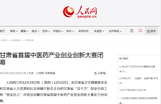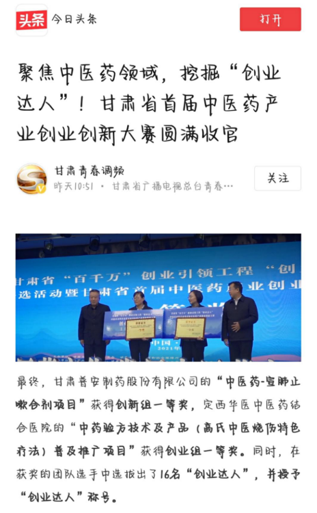 此次大賽也受到了媒體朋友的高度關注,相繼由人民網、中新網、今日頭條、試聽甘肅、新甘肅、甘肅青春調頻等多家媒體相繼報道了甘肅普安制藥股份有限公司在此次大賽中獲得創(chuàng)新組一等獎及“創(chuàng)業(yè)達人”稱號的事宜。