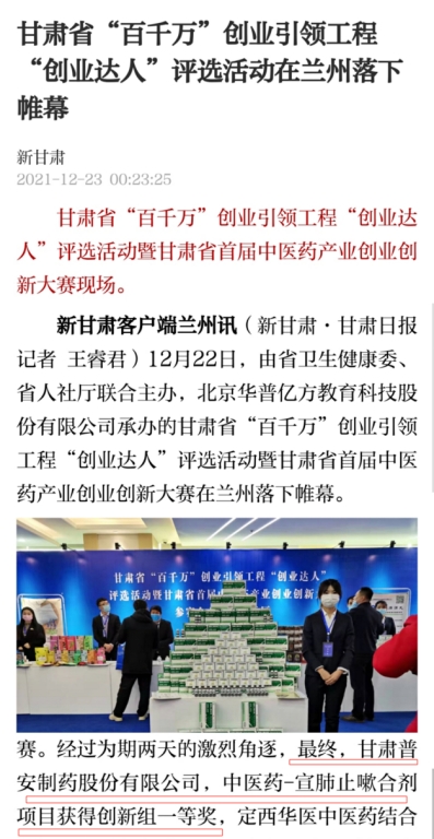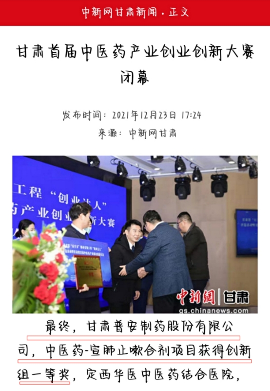 多家媒體爭相報道,“甘肅普安制藥股份有限公司榮獲甘肅省首屆中醫(yī)藥產業(yè)創(chuàng)業(yè)創(chuàng)新大賽創(chuàng)新組第一”強勢霸屏