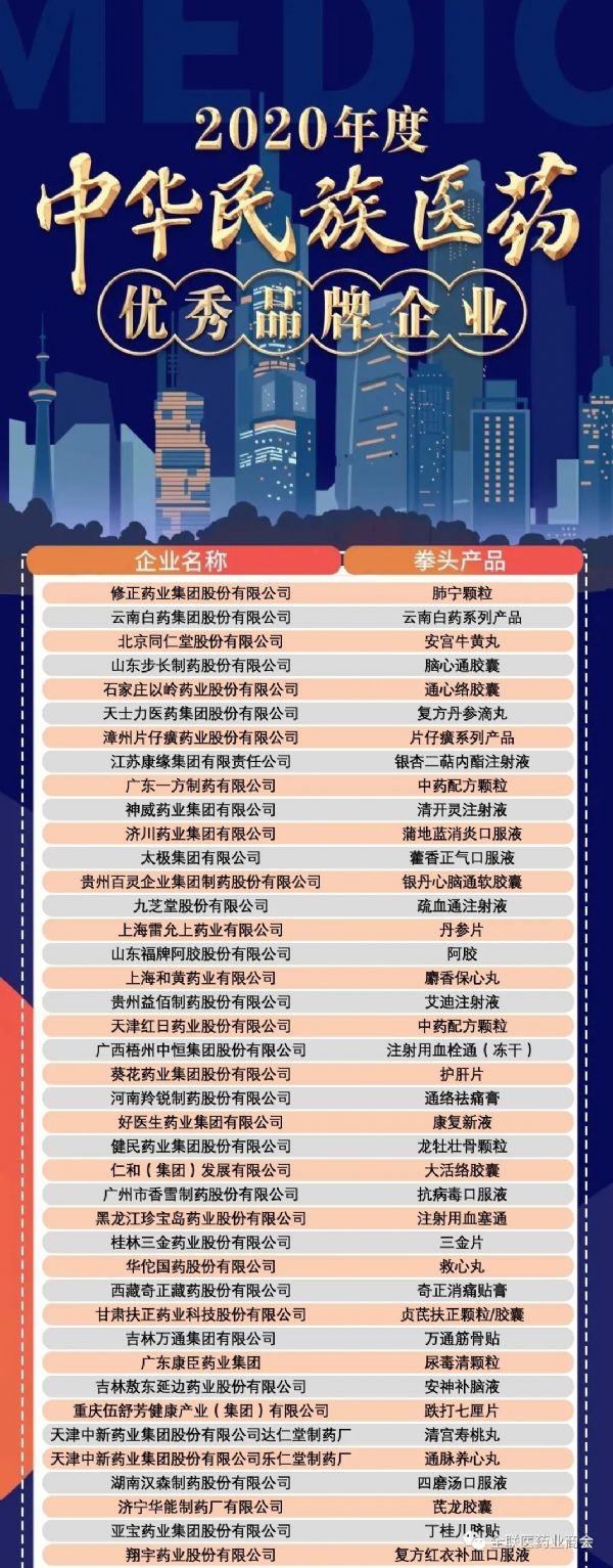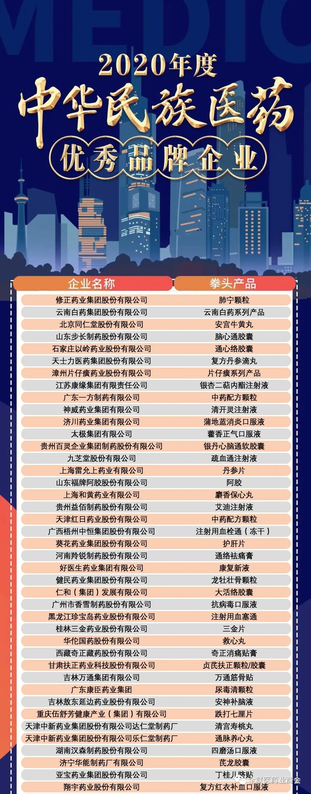 全國工商聯醫(yī)藥業(yè)商會通過企業(yè)申報、地方工商聯推薦、各專業(yè)分會信息匯總以及網絡數據分析等途徑,經過秘書處統計整理,綜合市場銷售額、行業(yè)占比、品牌認知、科技創(chuàng)新、國際化程度以及企業(yè)專精特新的特點等因素,報評審委員會評選出“2020 年度中華民族醫(yī)藥優(yōu)秀品牌企業(yè)”。本次評選,旨在弘揚民族醫(yī)藥、打造民族品牌,樹立行業(yè)標桿、發(fā)揮榜樣作用、促進民族醫(yī)藥產業(yè)健康發(fā)展。