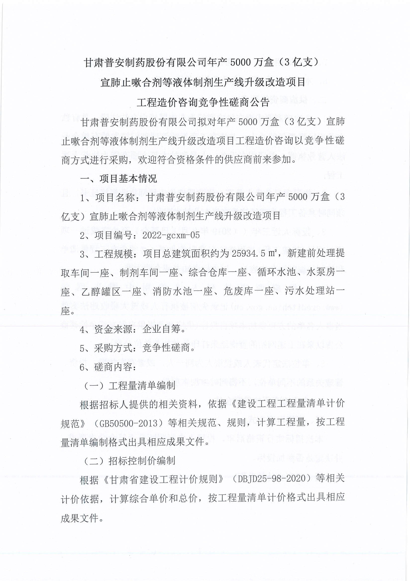 甘肅普安制藥股份有限公司年產(chǎn)5000萬盒(3億支)宣肺止嗽合劑等液體制劑生產(chǎn)線升級(jí)改造項(xiàng)目工程造價(jià)咨詢競(jìng)爭(zhēng)性磋商公告