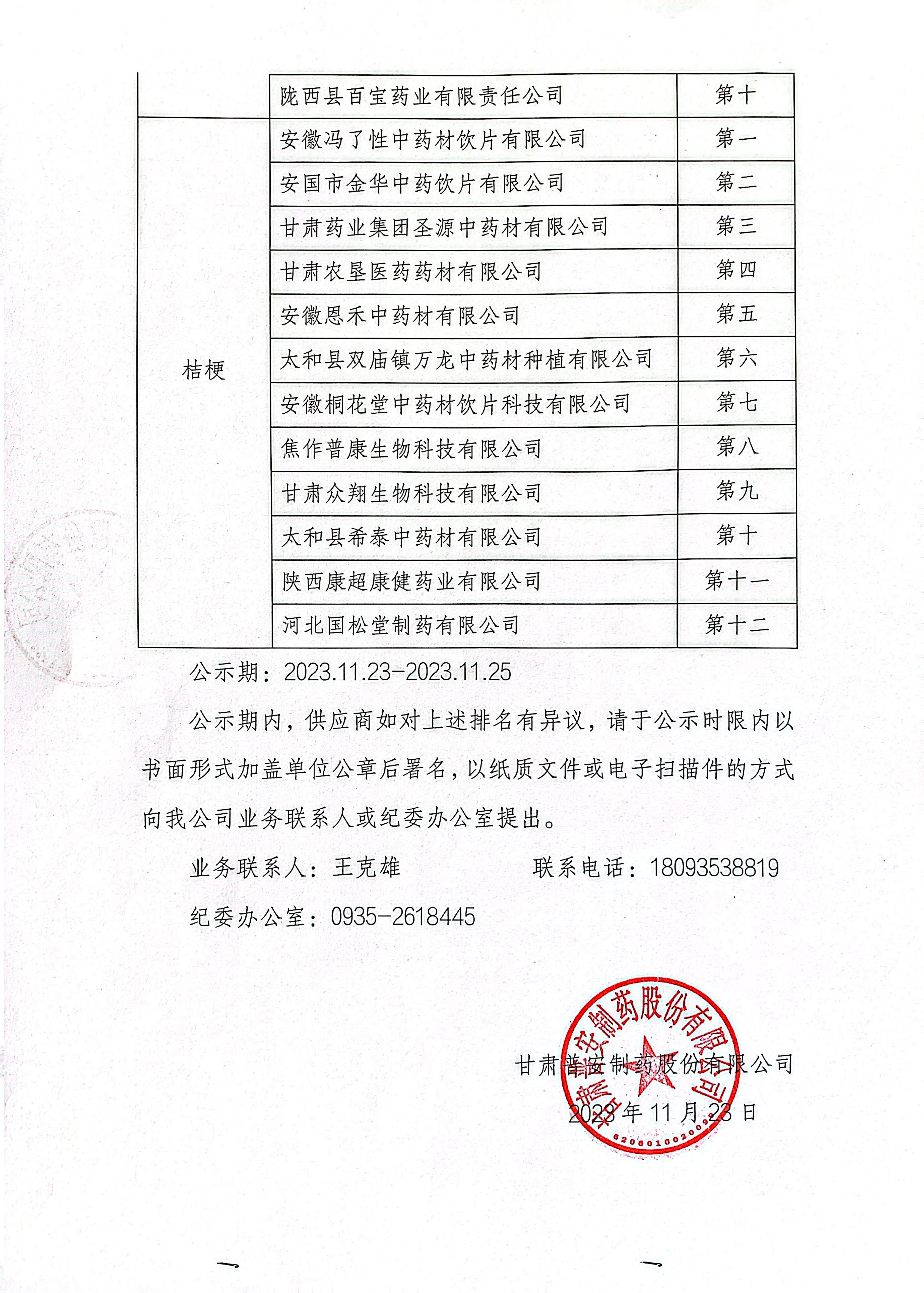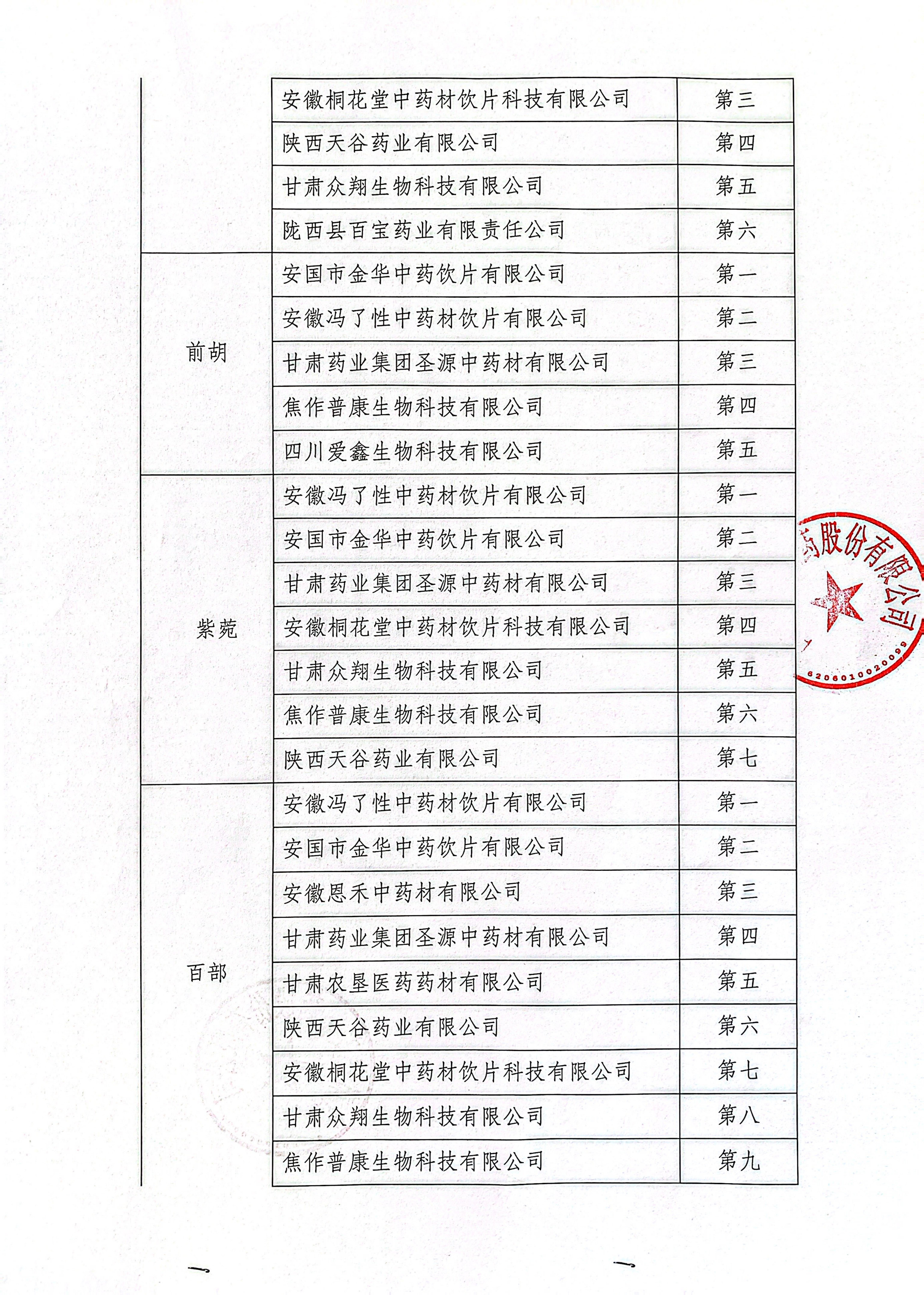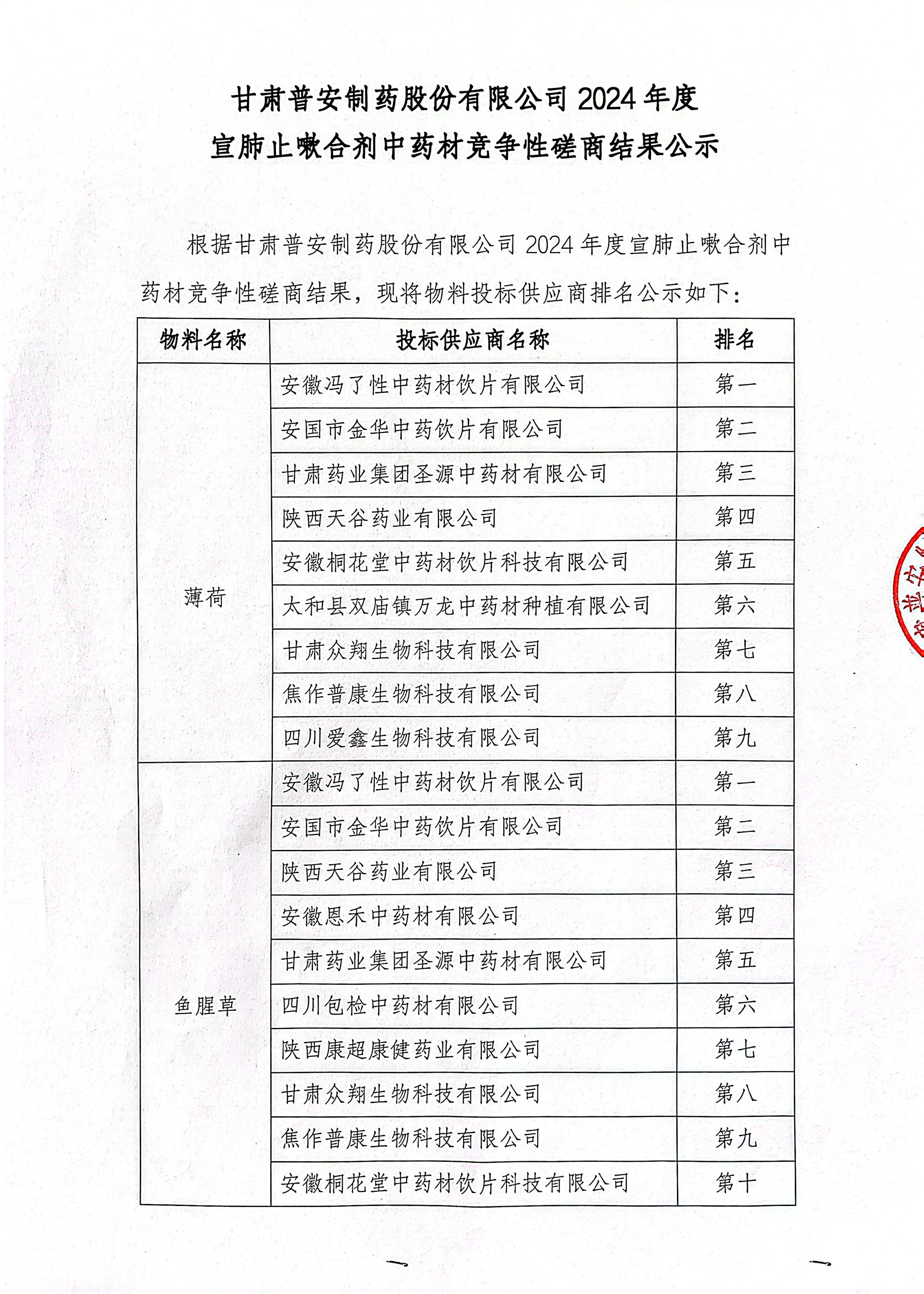 甘肅普安制藥股份有限公司2024年度宣肺止嗽合劑中藥材競爭性磋商結(jié)果公示