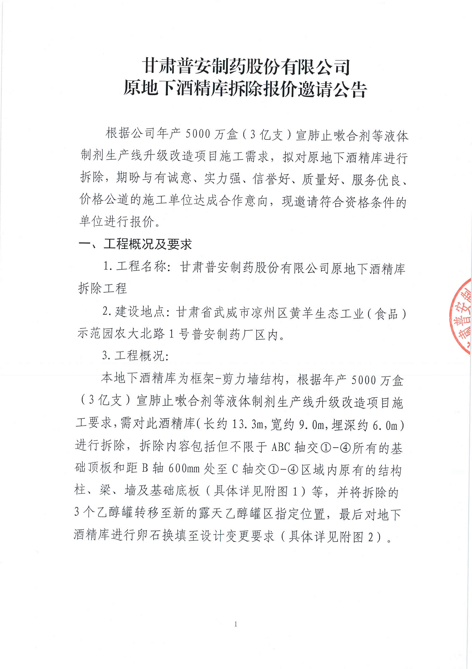 甘肅普安制藥股份有限公司原地下酒精庫拆除報(bào)價(jià)邀請(qǐng)公告