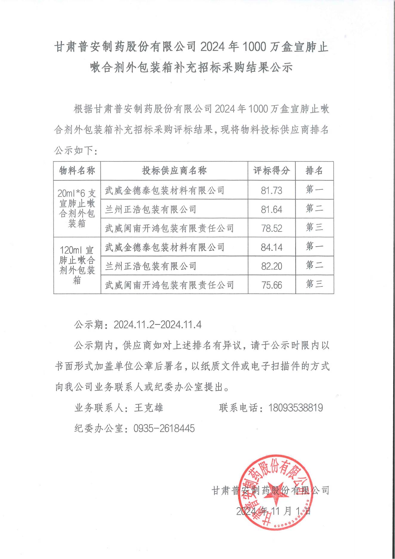 甘肅普安制藥股份有限公司2024年1000萬盒宣肺止嗽合劑外包裝箱補(bǔ)充招標(biāo)采購結(jié)果公示