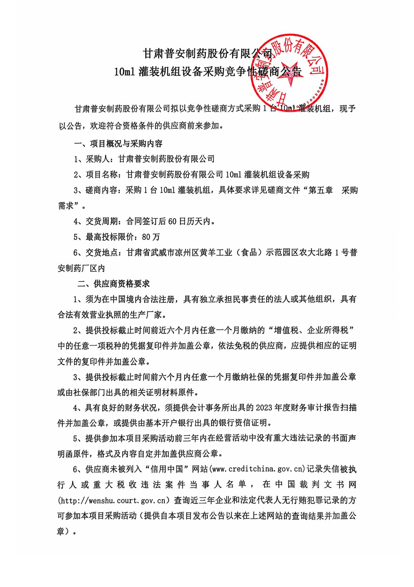 甘肅普安制藥股份有限公司10ml灌裝機(jī)組設(shè)備采購(gòu)競(jìng)爭(zhēng)性磋商公告