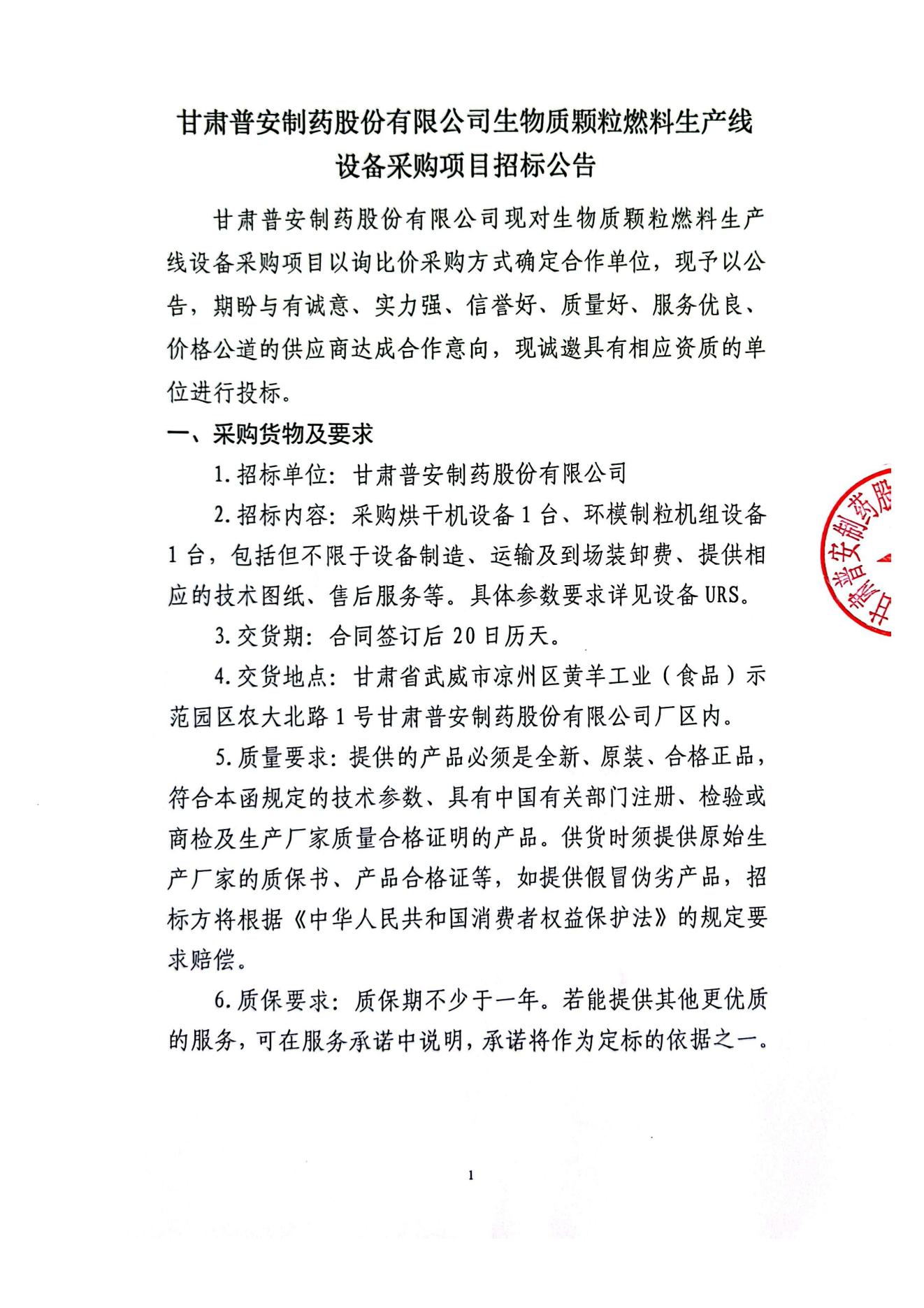 甘肅普安制藥股份有限公司生物質(zhì)顆粒燃料生產(chǎn)線設(shè)備采購項目