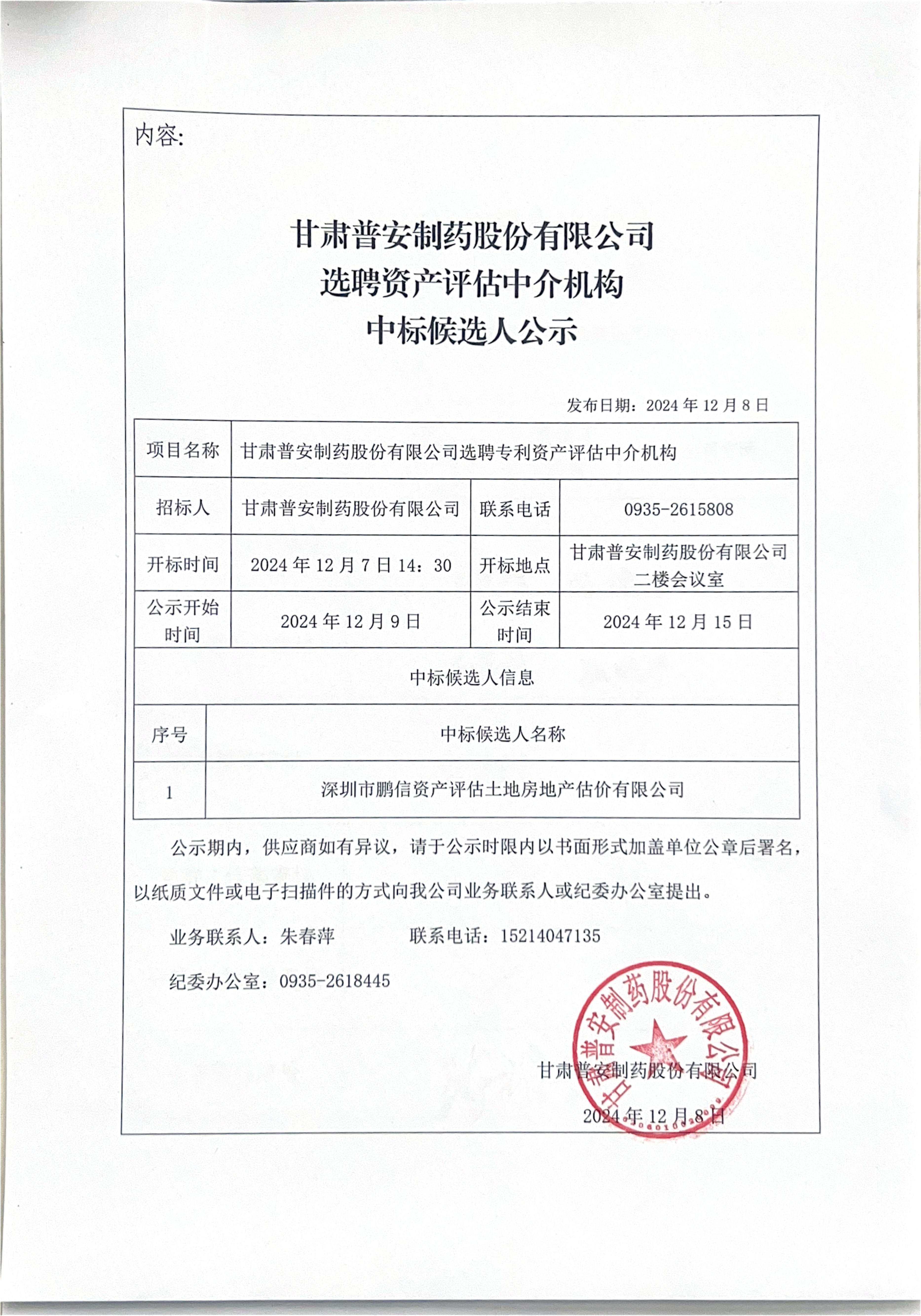 甘肅普安制藥股份有限公司選聘資產(chǎn)評(píng)估中介機(jī)構(gòu)中標(biāo)候選人公示