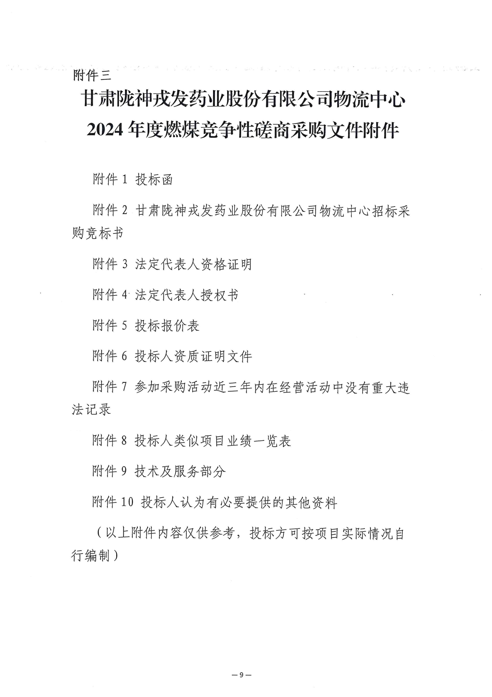 甘肅隴神戎發(fā)藥業(yè)股份有限公司物流中心2024年度燃煤競爭性磋商采購公告