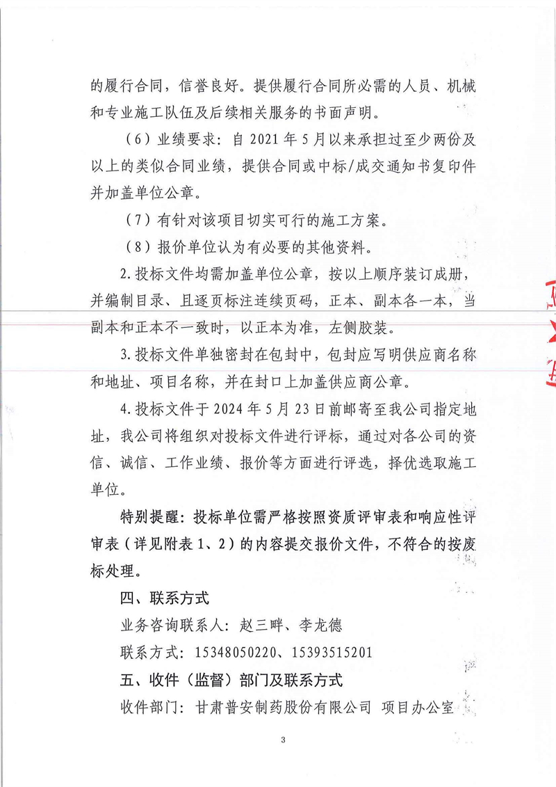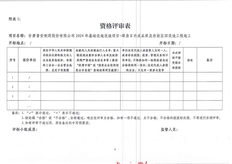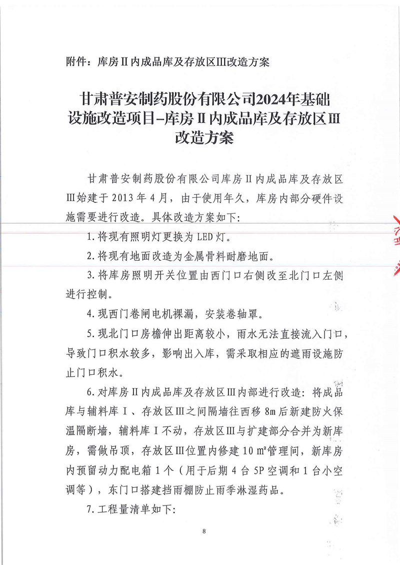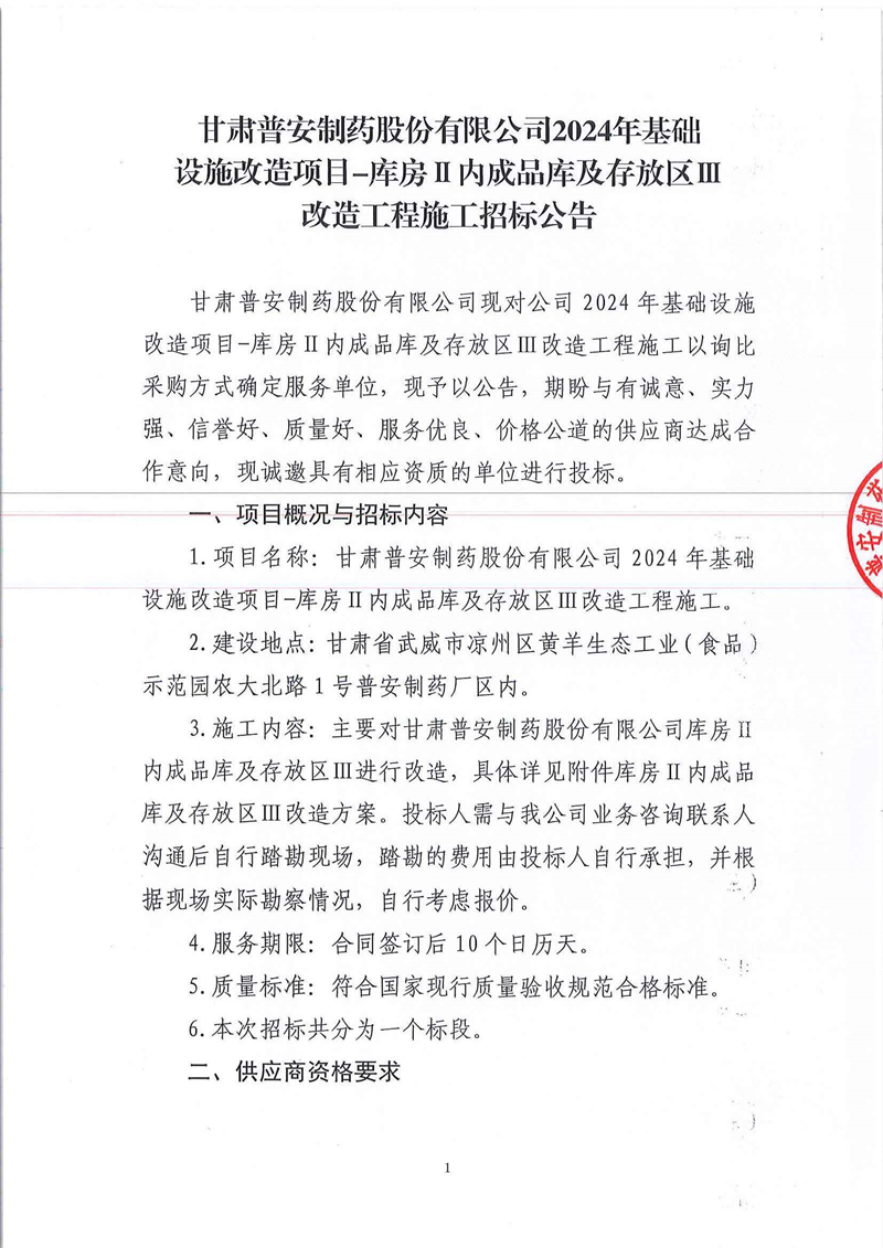 甘肅普安制藥股份有限公司2024年基礎(chǔ)設(shè)施改造項目-庫房Ⅱ內(nèi)成品庫及存放區(qū)Ⅲ改造工程施工招標公告