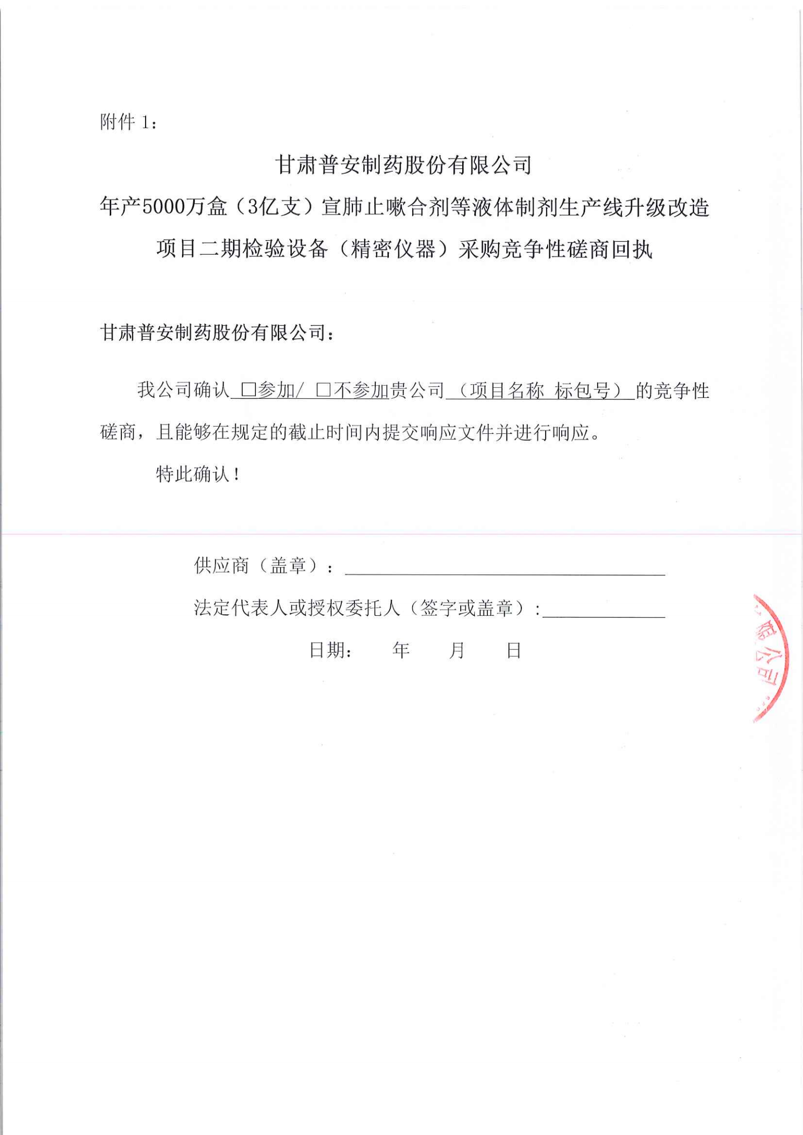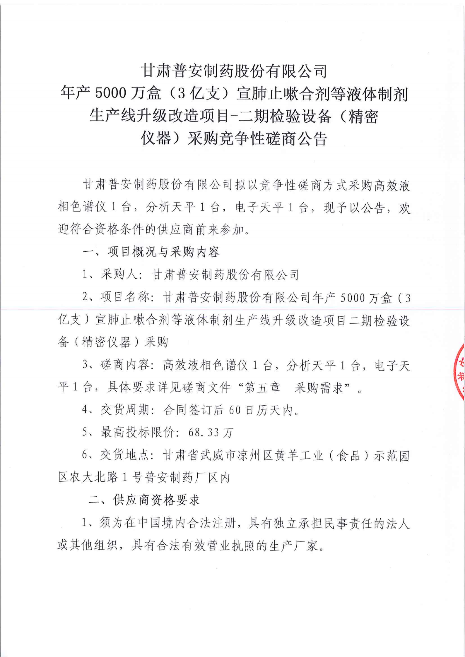 甘肅普安制藥股份有限公司年產(chǎn)5000萬(wàn)盒(3億支)宣肺止嗽合劑等液體制劑生產(chǎn)線升級(jí)改造項(xiàng)目二期檢驗(yàn)設(shè)備(精密儀器)采購(gòu)競(jìng)爭(zhēng)性磋商公告