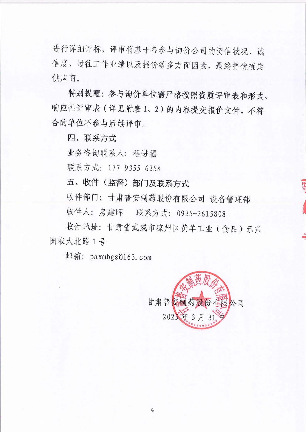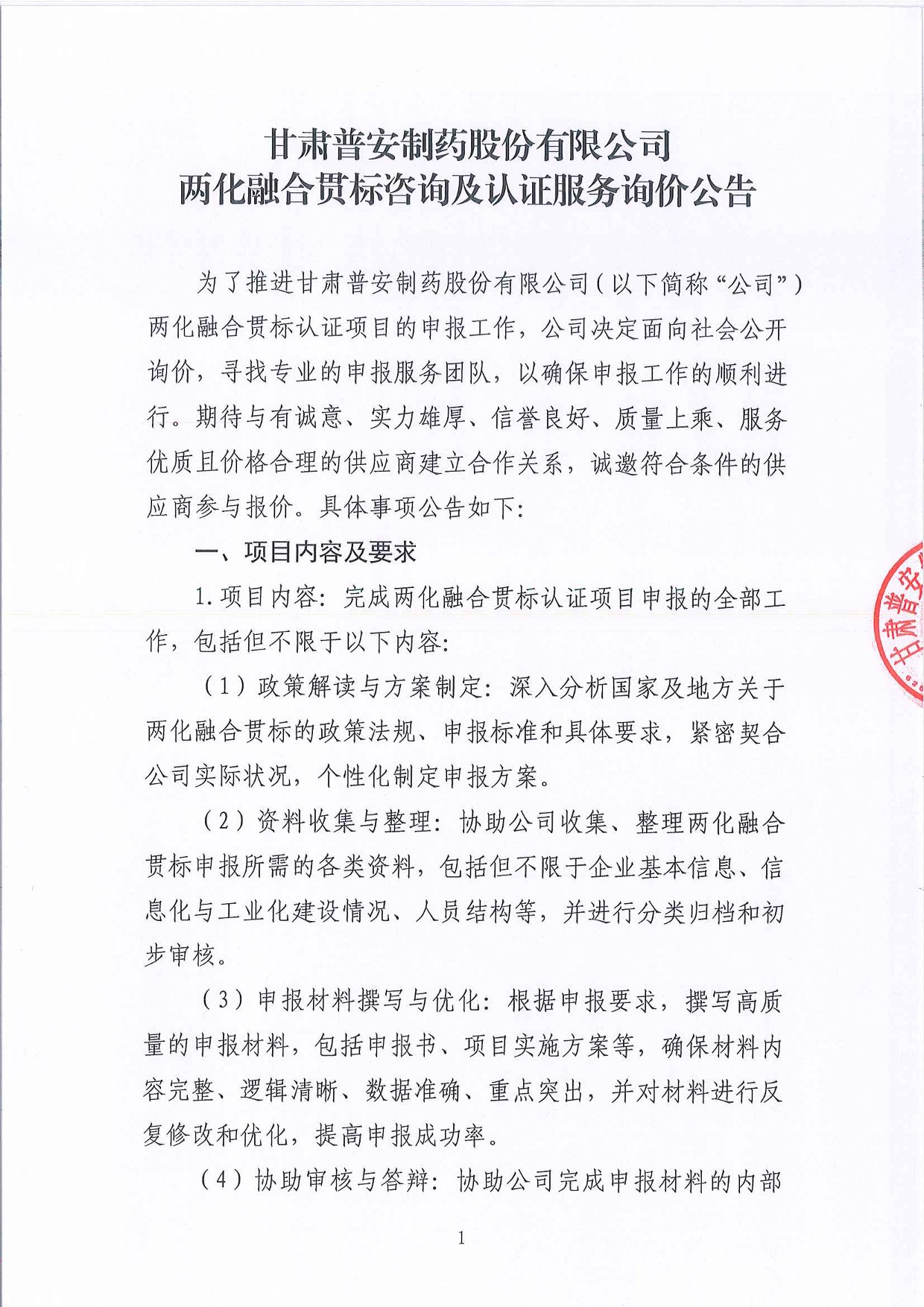 甘肅普安制藥股份有限公司兩化融合貫標(biāo)咨詢(xún)及認(rèn)證服務(wù)詢(xún)價(jià)公告